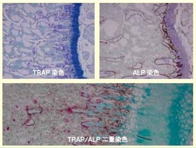 了解活體的骨代謝狀態是研究相關細胞生理活性的一個有效方法。對骨組織進行堿性磷酸酶(ALP)染色后可以了解成骨細胞的骨形成情況,對骨組織進行抗酒石酸酸性磷酸酶(TRAP)染色可以了解破骨細胞的骨吸收情況。若在同一切片上進行雙重染色就能同時了解兩者的情況。另外,它有一個優點是在脫鈣標本里,只要可以雙重染色,無需專用的設備,僅用一般的設備就可以方便地觀察到骨代謝。在此前提下,我們需要研究探討雙重染色的可行性。