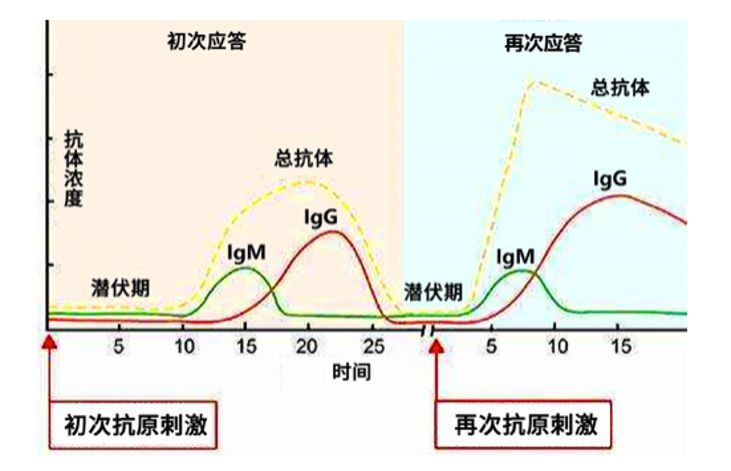 IgM 是人體接觸外來抗原時最早產生的抗體,一般在感染 3~7 天內由 B 淋巴細胞直接產生,產生 IgM 的 B 淋巴細胞隨后轉移至淋巴結,在發生中心接受 T 細胞和抗原提呈細胞的刺激,進一步成熟,分化為漿細胞,大量產生 IgG。