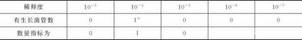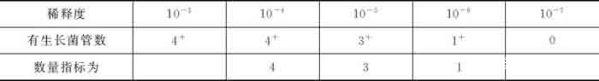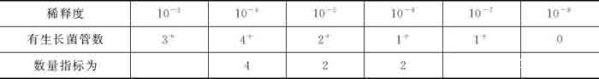 取各重復管數都有菌生長的最高稀釋度的生長管數,為數量指標的第一個數字,其后兩個稀釋度的生長管數作為其他的個數。就上例4個重復生長的有10-3及10-4兩個稀釋度,取其中高稀釋度10-4,其中生長管數“4”作為數量指標的第一位數字;10-5為3及10-6為1,因此所得數量指標為4、3、1。