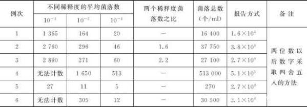 若有兩個稀釋度,其平均菌落數均在30~300之間,應按兩者菌落總數之比值來決定。若其比例小于2應報告兩者的平均數,若大于2則報告其中稀釋度較小的菌落總數(表10-1中例2、例3)。
