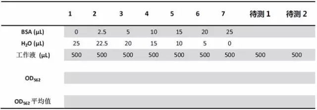 1. 配制 BCA 工作液:根據標準品和樣品數量,按 50 體積試劑 A,1 體積試劑 B 配制適量 BCA 工作液。充分混勻。