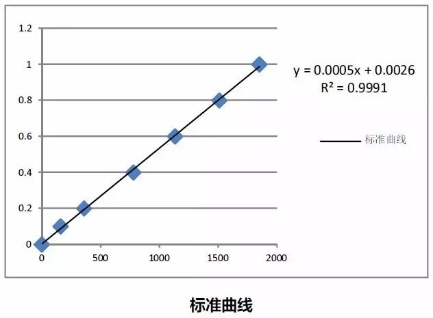 二、未知樣品蛋白質濃度測定 測定方法同上,取合適的未知樣品體積,使其測定值在標準曲線的直線范圍內。根據所測定的 A595 nm 值,在標準曲線上查出其相當于標準蛋白的量,從而計算出未知樣品的蛋白質濃度(mg/mL)。