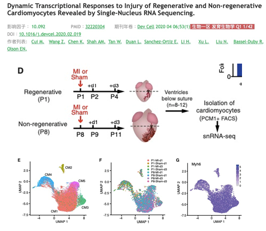 研究目的:通過單核RNA測序(snRNA- seq)揭示心臟再生反應的分子機制及其在晚期的阻斷作用