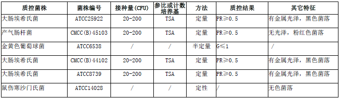 按標(biāo)簽用法制備培養(yǎng)基,接種以下質(zhì)控菌株,放置36±1℃需氧培養(yǎng)18-24小時。