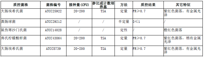 按標(biāo)簽用法制備培養(yǎng)基,接種以下質(zhì)控菌株,放置36±1℃需氧培養(yǎng)24±2小時(shí)。