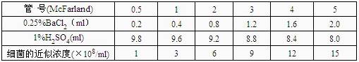 麥氏比濁管是McFarland發明的一種用于微生物比濁的不同濁度的標準濁度管。具體的配制方法是根據硫酸和氯化鋇的比例來定的,有表可查,這樣不同比例生成的硫酸鋇沉淀的濃度不同,且都有定值。麥氏比濁管的配比如下: