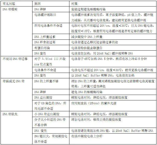 較成功的電泳結果是分子量標準條帶整齊清晰,樣品條帶也整齊清晰,如果條帶模糊暗淡,單從瓊脂糖凝膠電泳角度來說,可能的原因:溴化乙錠的質和量怎樣?溴化乙錠見光易分解,母液配制時間過長或保存不當(一般4℃ 避光保存一年內有效),或者終濃度沒達到0.5 vg/ml;電泳槽中緩沖液使用次數過多,緩沖能力下降。特別是TAE緩沖液,一般用2~3次就要更換,TBE緩沖液則可使用10次左右。